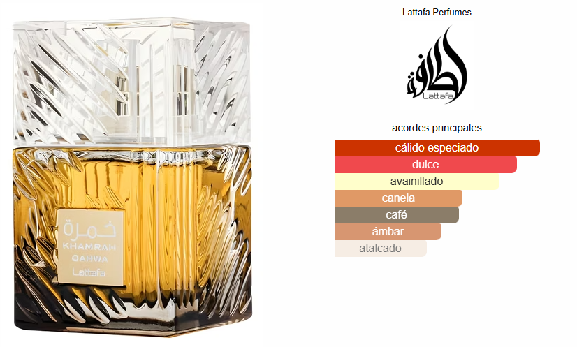Khamrah Qahwa de Lattafa Perfumes es una fragancia de la familia olfativa Oriental Vainilla para Hombres y Mujeres. Khamrah Qahwa se lanzó en 2023. Las Notas de Salida son canela, cardamomo y jengibre; las Notas de Corazón son praliné, Frutas confitadas y flores blancas; las Notas de Fondo son vainilla, café, haba tonka, benjuí y almizcle.