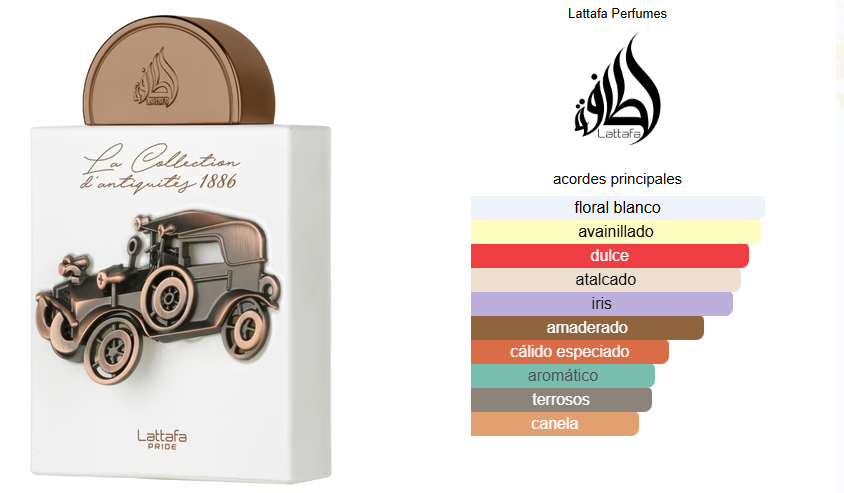 La Collection D’antiquités 1886 de Lattafa Perfumes es una fragancia de la familia olfativa Aromática para Hombres y Mujeres. La Collection D’antiquités 1886 se lanzó en 2023. Las Notas de Salida son yerba mate y bergamota; las Notas de Corazón son raíz de lirio, haba tonka, canela, jazmín y Corteza; las Notas de Fondo son chocolate blanco, vainilla, tabaco de flor blanca, almizcle blanco y pachulí.