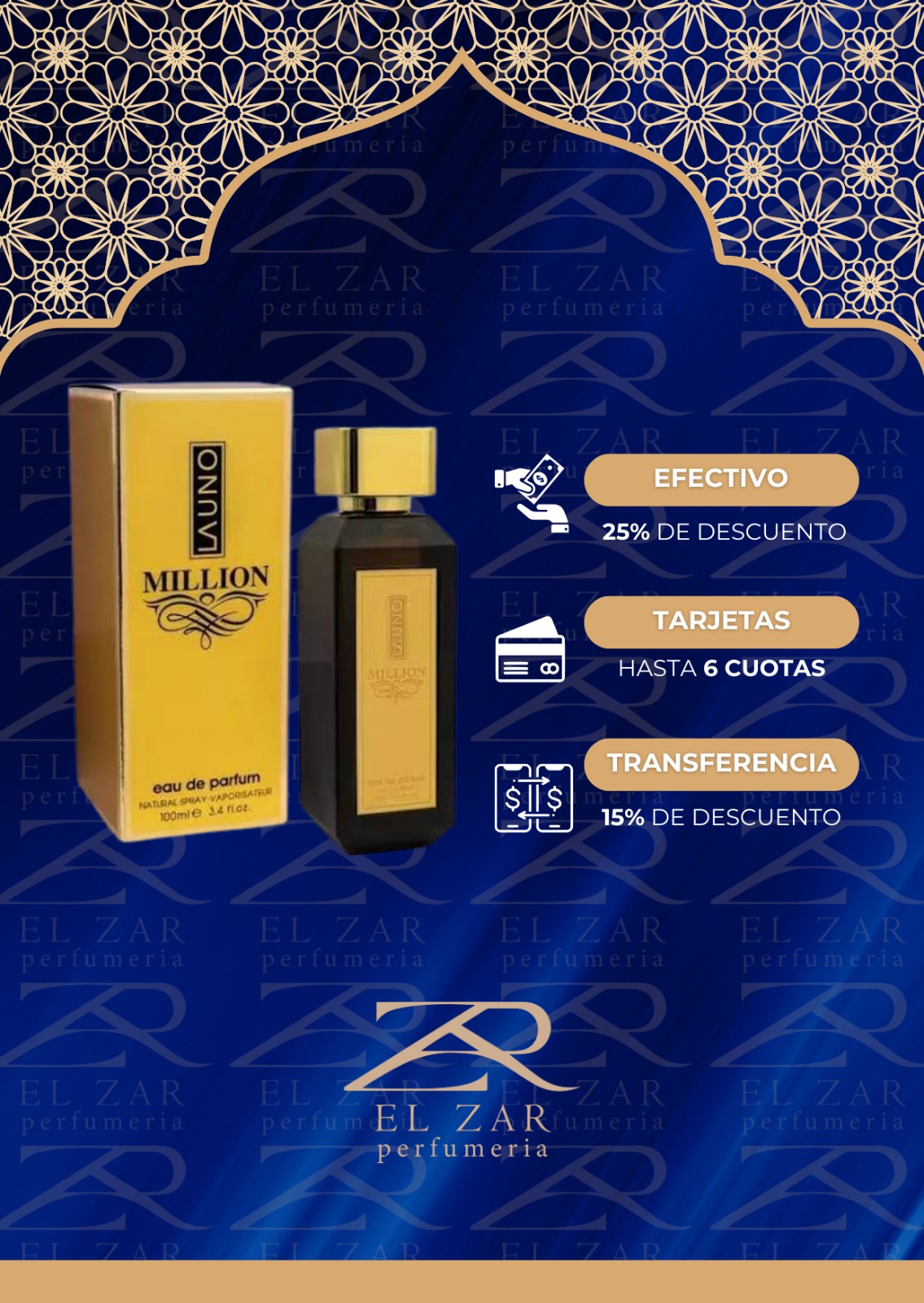 La uno Million Parfum es una fraganciia masculina inspirada en 1 Million de Paco Rabbane Parfum. Es una fragancia que evoca, lujo, sensualidad y seguridad. Diseñada para hombres que buscan destacar con estilo. Ideal para ocasiones nocturnas, citas románticas o ambientes formales. Se siente poderosa en climas templados o fríos. Notas de salida: Nardos, sal, notas solares. Notas de Corazón: Aceite de Monroi, ámbar gris, cruero. Notas de Fondo: Cachemira, ládano y pino.