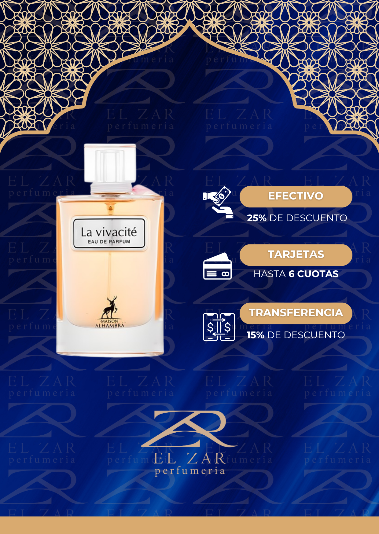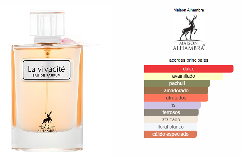 La Vivacité de Maison Alhambra es una fragancia de la familia olfativa Floral Frutal para Mujeres. La Vivacité se lanzó en 2024. Las Notas de Salida son grosellas negras y pera; las Notas de Corazón son iris, flor de azahar del naranjo y jazmín; las Notas de Fondo son pachulí, haba tonka, praliné y vainilla.