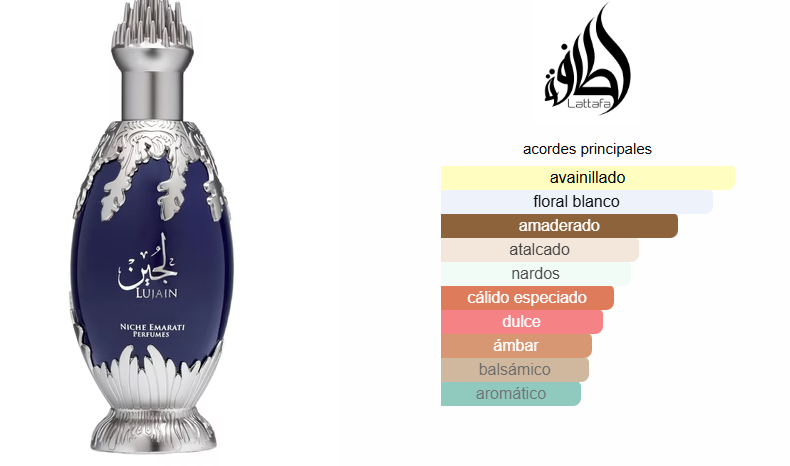 Lujain de Lattafa Perfumes es una fragancia de la familia olfativa Almizcle Floral Amaderado para Hombres y Mujeres. La Nota de Salida es rosa; las Notas de Corazón son jazmín sambac (sampaguita) y nardos; las Notas de Fondo son sándalo, haba tonka y vainilla.