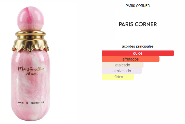 Marshmallow Blush de PARIS CORNER es una fragancia de la familia olfativa para Hombres y Mujeres. Esta fragrancia es nueva. Marshmallow Blush se lanzó en 2025. Las Notas de Salida son fresa, frambuesa y limón (lima ácida); las Notas de Corazón son ambroxan y flor de azahar del naranjo; las Notas de Fondo son malvavisco (bombón) y almizcle.