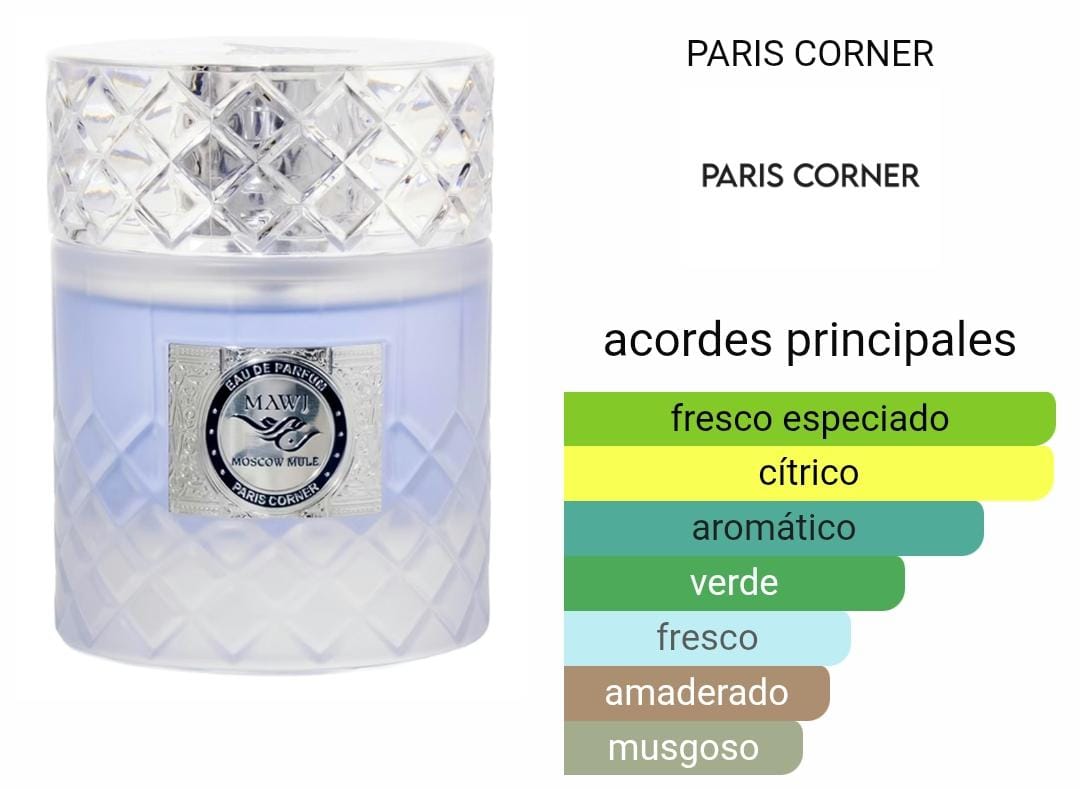 Mawj Moscow Mule de PARIS CORNER es una fragancia de la familia olfativa para Hombres y Mujeres. Las Notas de Salida son jengibre, limón (lima ácida) y bergamota; las Notas de Corazón son menta y ciprés; la Nota de Fondo es musgo.