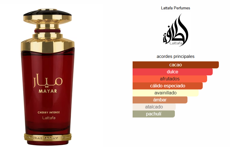 Mayar Cherry Intense de Lattafa Perfumes es una fragancia de la familia olfativa Oriental Vainilla para Hombres y Mujeres. Esta fragrancia es nueva. Mayar Cherry Intense se lanzó en 2024. Las Notas de Salida son fresa y bergamota; las Notas de Corazón son Cherry Jam y cacao; las Notas de Fondo son vainilla, ámbar y pachulí.