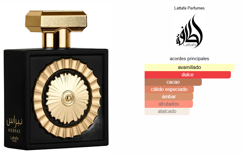 Nebras de Lattafa Perfumes es una fragancia de la familia olfativa Oriental Vainilla para Hombres y Mujeres. Nebras se lanzó en 2022. Las Notas de Salida son bayas rojas y mandarina; las Notas de Corazón son vainilla, cacao y rosa; las Notas de Fondo son azúcar, haba tonka, ámbar y almizcle.