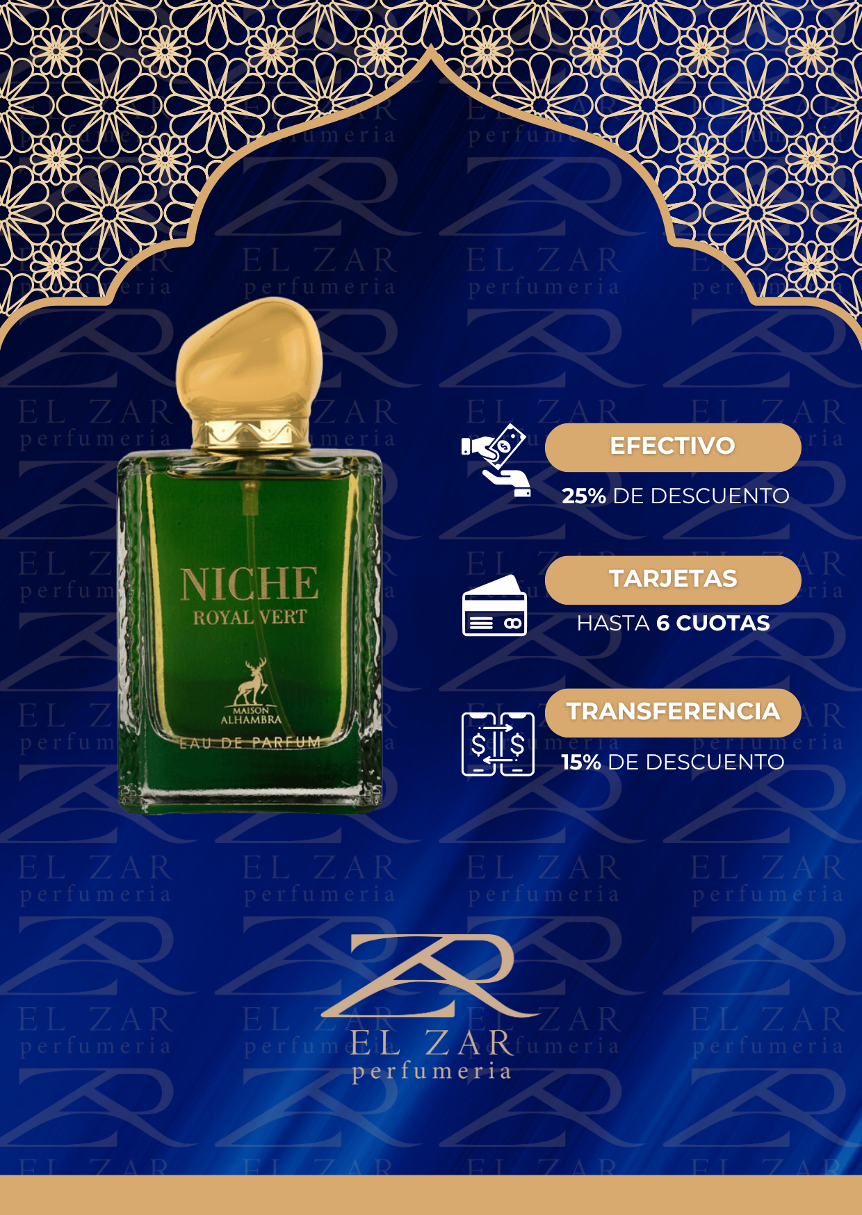 Niche Royal Vert de Maison Alhambra es una fragancia de la familia olfativa Oriental Amaderada para Hombres. Niche Royal Vert se lanzó en 2022. Las Notas de Salida son limón siciliano (lima siciliana), bergamota, naranja tangerina y notas verdes; las Notas de Corazón son lirio de los valles (muguete), jazmín, rosa y violeta; las Notas de Fondo son almizcle, cedro, sándalo y ámbar.