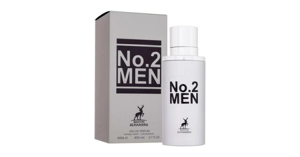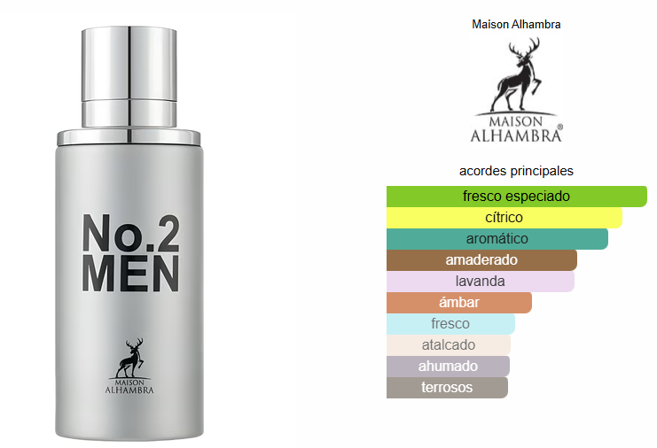 No. 2 Men de Maison Alhambra es una fragancia de la familia olfativa Aromática para Hombres. No. 2 Men se lanzó en 2022. Las Notas de Salida son bergamota y lavanda; las Notas de Corazón son jengibre y cardamomo; las Notas de Fondo son vetiver, incienso, almizcle, sándalo, ládano y madera de gaiac.