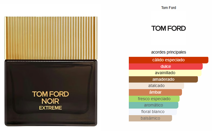 Noir Extreme de Tom Ford es una fragancia de la familia olfativa Oriental Amaderada para Hombres. Noir Extreme se lanzó en 2015. La Nariz detrás de esta fragrancia es Sonia Constant. Las Notas de Salida son cardamomo, nuez moscada, azafrán, mandarina y neroli; las Notas de Corazón son Kulfi, rosa, resina almáciga del lentisco, jazmín y flor de azahar del naranjo; las Notas de Fondo son vainilla, ámbar, notas amaderadas y sándalo.