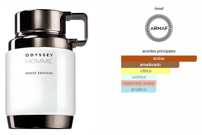 Odyssey Homme White Edition de Armaf es una fragancia de la familia olfativa Oriental Fougère para Hombres. Las Notas de Salida son yuzu, pimienta rosa y toronja (pomelo); las Notas de Corazón son hojas de violeta y notas marinas; las Notas de Fondo son ámbar, Amberwood y madera de gaiac.