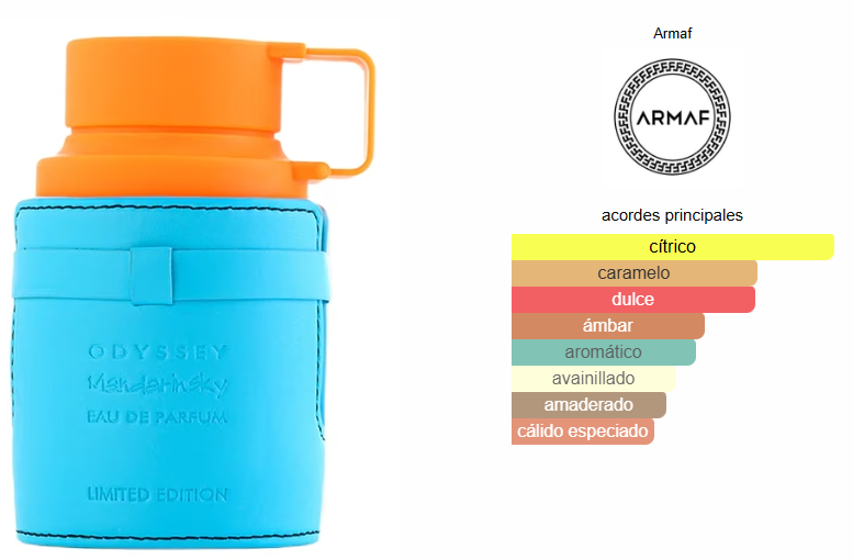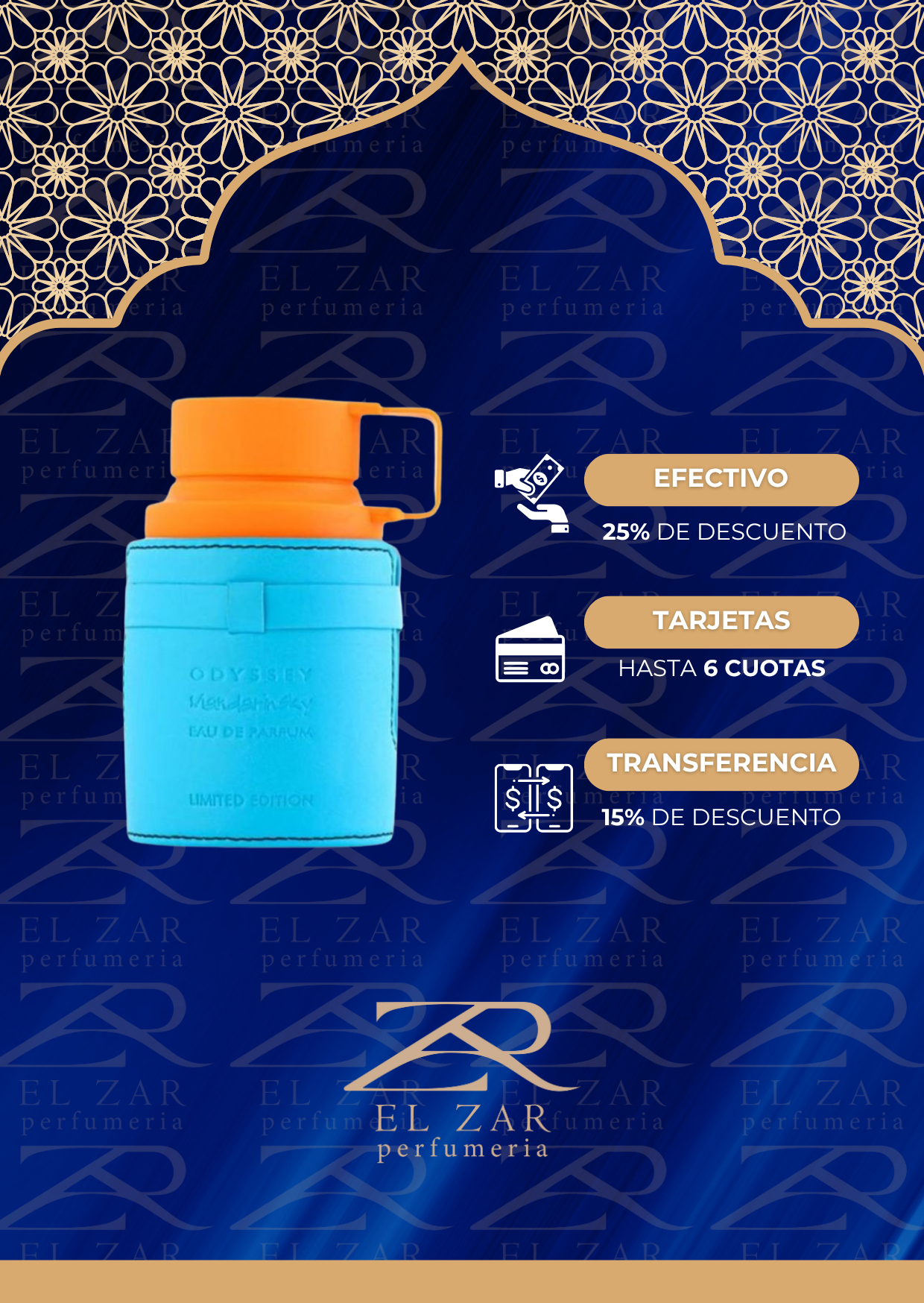 Odyssey Mandarin Sky de Armaf es una fragancia de la familia olfativa para Hombres. Odyssey Mandarin Sky se lanzó en 2023. Las Notas de Salida son mandarina, naranja, azafrán y salvia; las Notas de Corazón son caramelo, haba tonka y cempasúchil (tagete, clavelón); las Notas de Fondo son ambroxan, cedro y vetiver.