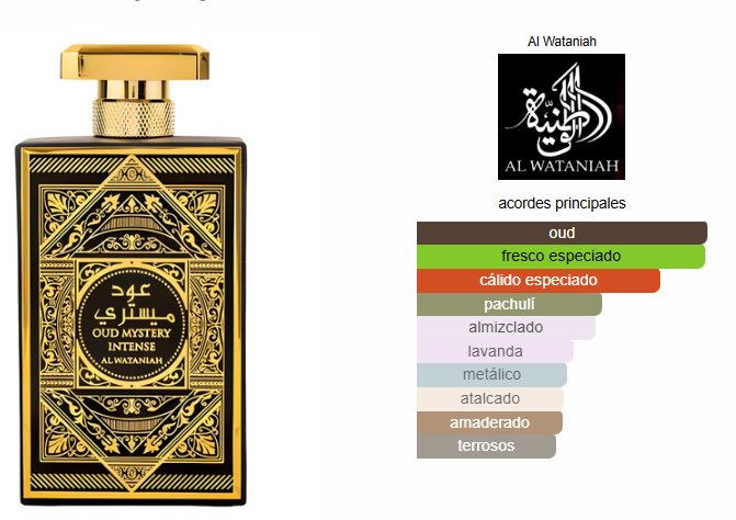 Oud Mystery Intense de Al Wataniah es una fragancia de la familia olfativa Amaderada Especiada para Hombres y Mujeres. Oud Mystery Intense se lanzó en 2023. Las Notas de Salida son nuez moscada, azafrán y lavanda; la Nota de Corazón es madera de oud; las Notas de Fondo son pachulí y almizcle.