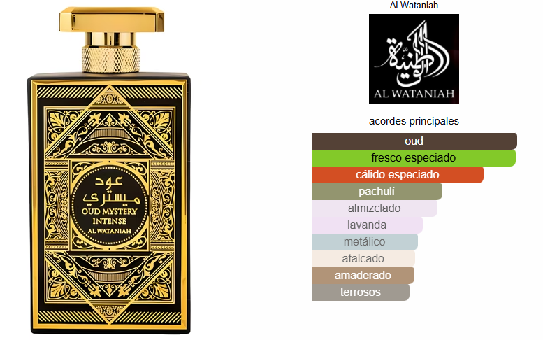 Oud Mystery Intense de Al Wataniah es una fragancia de la familia olfativa Amaderada Especiada para Hombres y Mujeres. Oud Mystery Intense se lanzó en 2023. Las Notas de Salida son nuez moscada, azafrán y lavanda; la Nota de Corazón es madera de oud; las Notas de Fondo son pachulí y almizcle.
