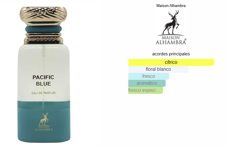 Pacific Blue de Maison Alhambra es una fragancia de la familia olfativa para Hombres y Mujeres. Pacific Blue se lanzó en 2025. Las Notas de Salida son limón (lima ácida), bergamota, mandarina, naranja amarga, lavanda, romero y mirto; las Notas de Corazón son neroli, jazmín y flor de azahar del naranjo; las Notas de Fondo son ámbar, angélica y almizcle ambreta.