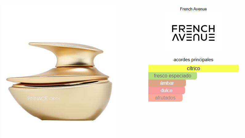 Pinnace Oryn de French Avenue es una fragancia de la familia olfativa Cítrica para Hombres. Esta fragrancia es nueva. Pinnace Oryn se lanzó en 2025. La Nariz detrás de esta fragrancia es Miroslav Petkov. Las Notas de Salida son mandarina, naranja y bergamota; la Nota de Corazón es jengibre; la Nota de Fondo es ámbar gris.