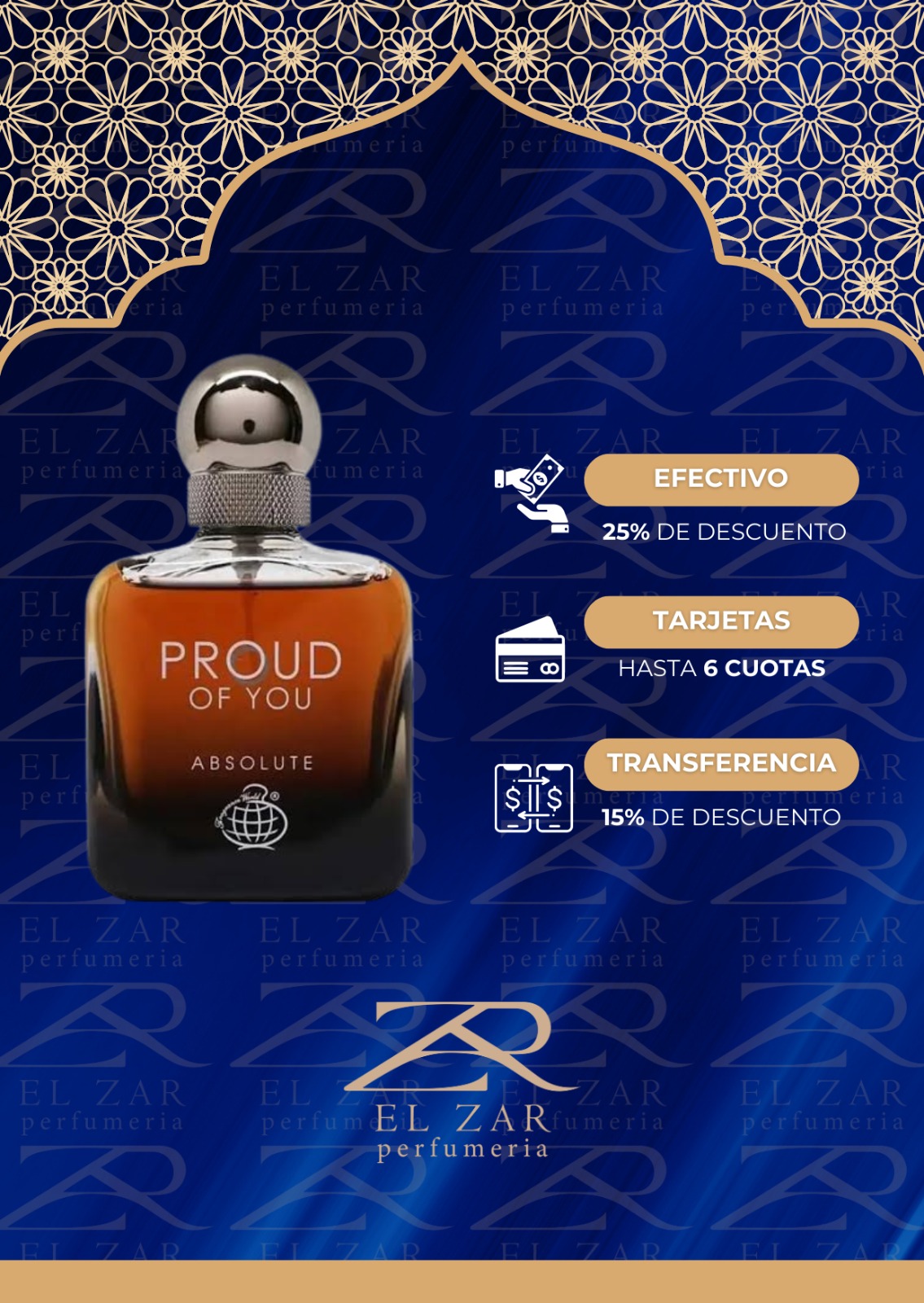 Proud Of You Absolute es una fragancia de la familia olfativa Oriental para Hombres. Proud Of You Absolute se lanzó en 2023. Las Notas de Salida son ron, bergamota y elemí; las Notas de Corazón son lavanda y Davana; las Notas de Fondo son vainilla de Madagascar, castaña, cedro y pachulí.