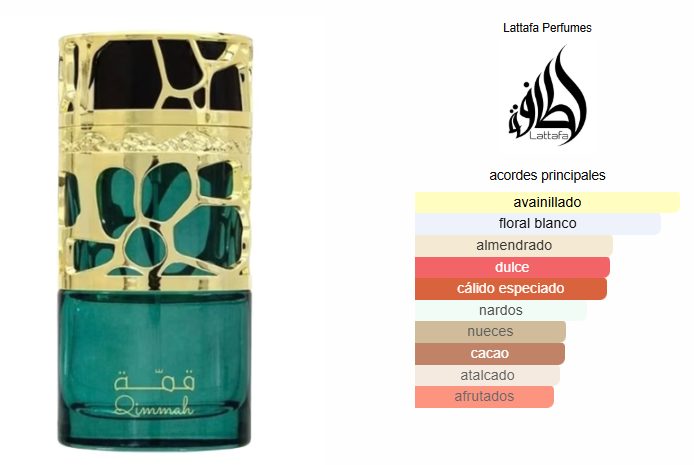 Qimmah for Women de Lattafa Perfumes es una fragancia de la familia olfativa para Mujeres. Qimmah for Women se lanzó en 2022. Las Notas de Salida son almendra y café; las Notas de Corazón son nardos, jazmín y haba tonka; las Notas de Fondo son vainilla, cacao y sándalo.
