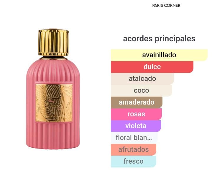 Qissa Pink de PARIS CORNER es una fragancia de la familia olfativa Floral Frutal para Mujeres. Qissa Pink se lanzó en 2024. Las Notas de Salida son coco y manzana; las Notas de Corazón son violeta, rosa y jazmín; las Notas de Fondo son vainilla, azúcar, sándalo, cedro y pachulí.