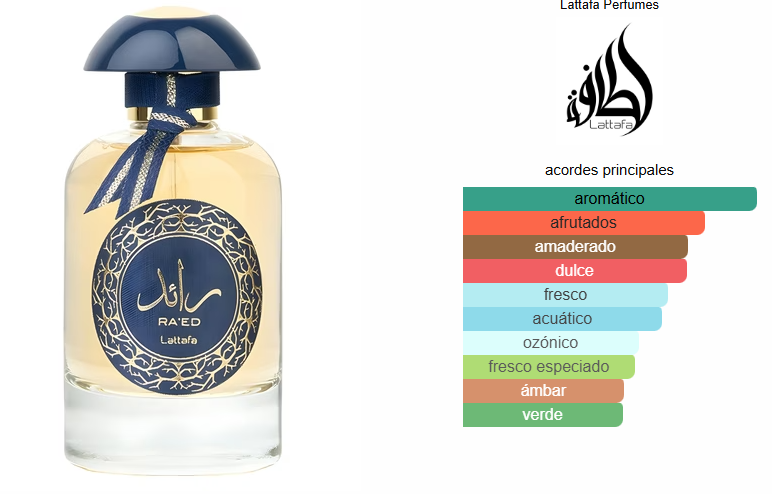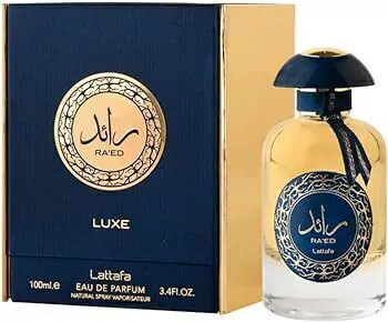 Ra’ed Luxe de Lattafa Perfumes es una fragancia de la familia olfativa Oriental Especiada para Hombres y Mujeres. Ra’ed Luxe se lanzó en 2019. Las Notas de Salida son sandía, enebro de Virginia, piña, jazmín, pimienta rosa y flor de la acacia de Constantinopla (árbol de la seda); las Notas de Corazón son notas herbales, salvia, lavanda y canela; las Notas de Fondo son Hielo, fresa, vetiver, sándalo, ámbar, vainilla, almizcle, castaña y haba tonka.