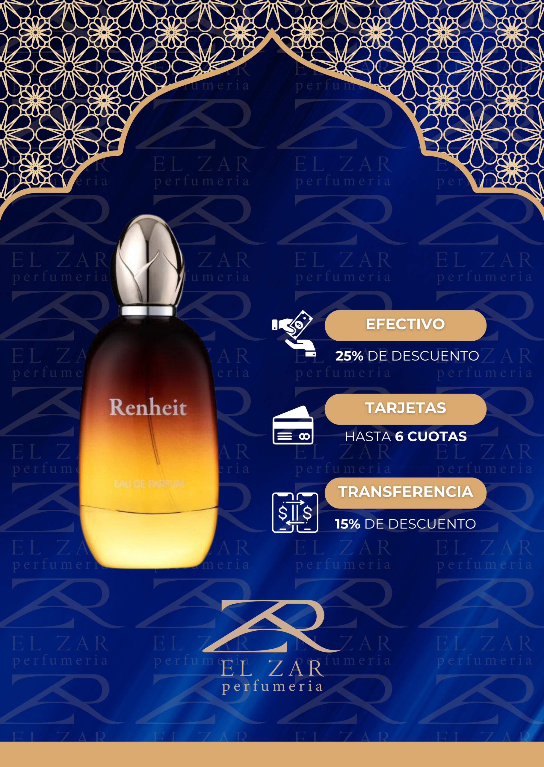 Renheit es una fragancia de la familia olfativa Aromática Especiada para Hombres. Renheit se lanzó en 2023. Las Notas de Salida son manzanilla, lavanda, mandarina, flor del espino, bergamota y nuez moscada; las Notas de Corazón son clavos de olor, madreselva, jazmín y nuez moscada; las Notas de Fondo son cuero, pachulí, almizcle y vetiver.