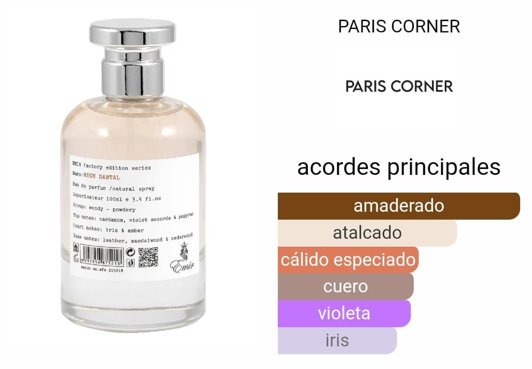 Factory Edition: Rich Santal de PARIS CORNER es una fragancia de la familia olfativa Amaderada Aromática para Hombres y Mujeres. Las Notas de Salida son violeta, cardamomo y papiro de Egipto; las Notas de Corazón son iris y ámbar; las Notas de Fondo son sándalo, cuero y cedro.