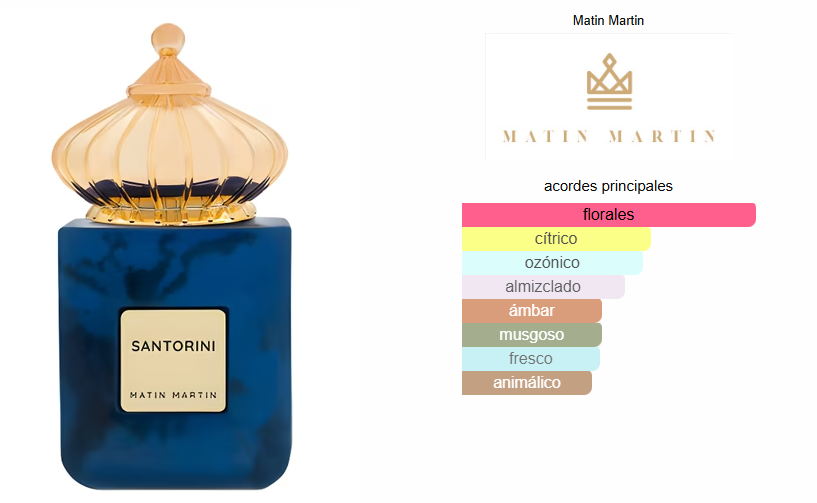 SANTORINI EAU DE PARFUM de Matin Martin es una fragancia de la familia olfativa Amaderada Especiada para Hombres y Mujeres. SANTORINI EAU DE PARFUM se lanzó en 2023. Las Notas de Salida son cítricos y notas ozónicas; las Notas de Corazón son notas florales y fresia; las Notas de Fondo son almizcle, ámbar gris y musgo.