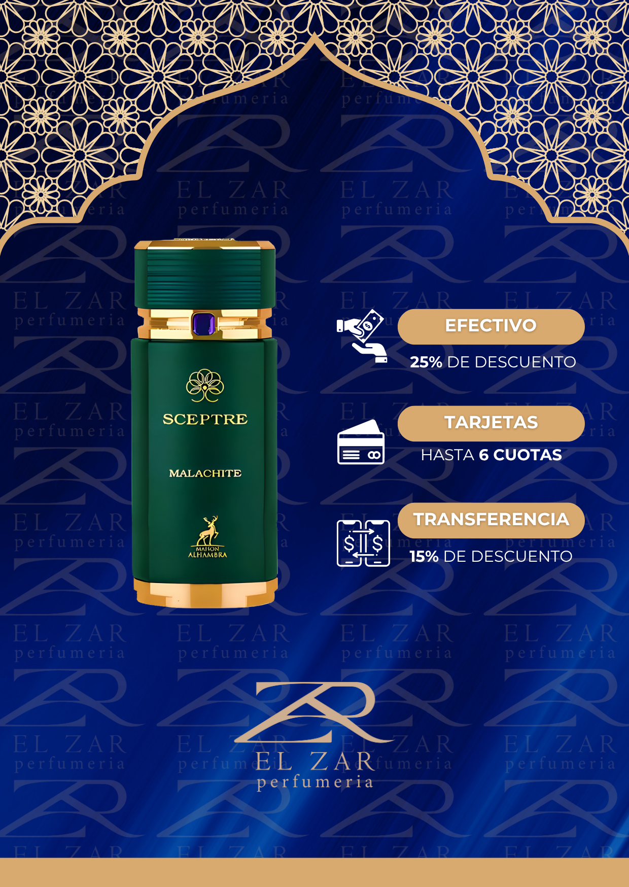 Sceptre Malachite de Maison Alhambra es una fragancia de la familia olfativa Oriental Amaderada para Hombres y Mujeres. Sceptre Malachite se lanzó en 2022. Las Notas de Salida son Mandarina verde, bergamota y grosellas negras; las Notas de Corazón son Notas aromáticas, notas especiadas, lavanda, pimienta rosa y jazmín; las Notas de Fondo son ámbar, almizcle, notas amaderadas y vetiver.
