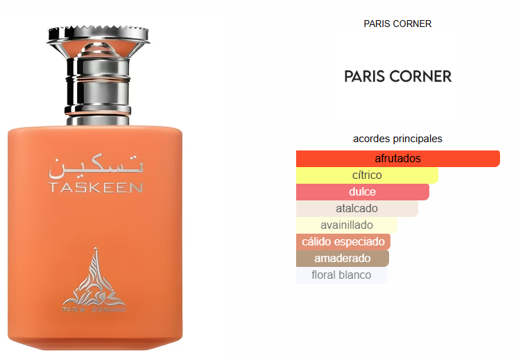 Taskeen de PARIS CORNER es una fragancia de la familia olfativa para Hombres y Mujeres. Las Notas de Salida son durazno (melocotón), naranja sanguina y cardamomo; las Notas de Corazón son jazmín, Davana, coñac y heliotropo; las Notas de Fondo son vainilla, benjuí, sándalo, cachemira, pachulí, haba tonka y ládano.