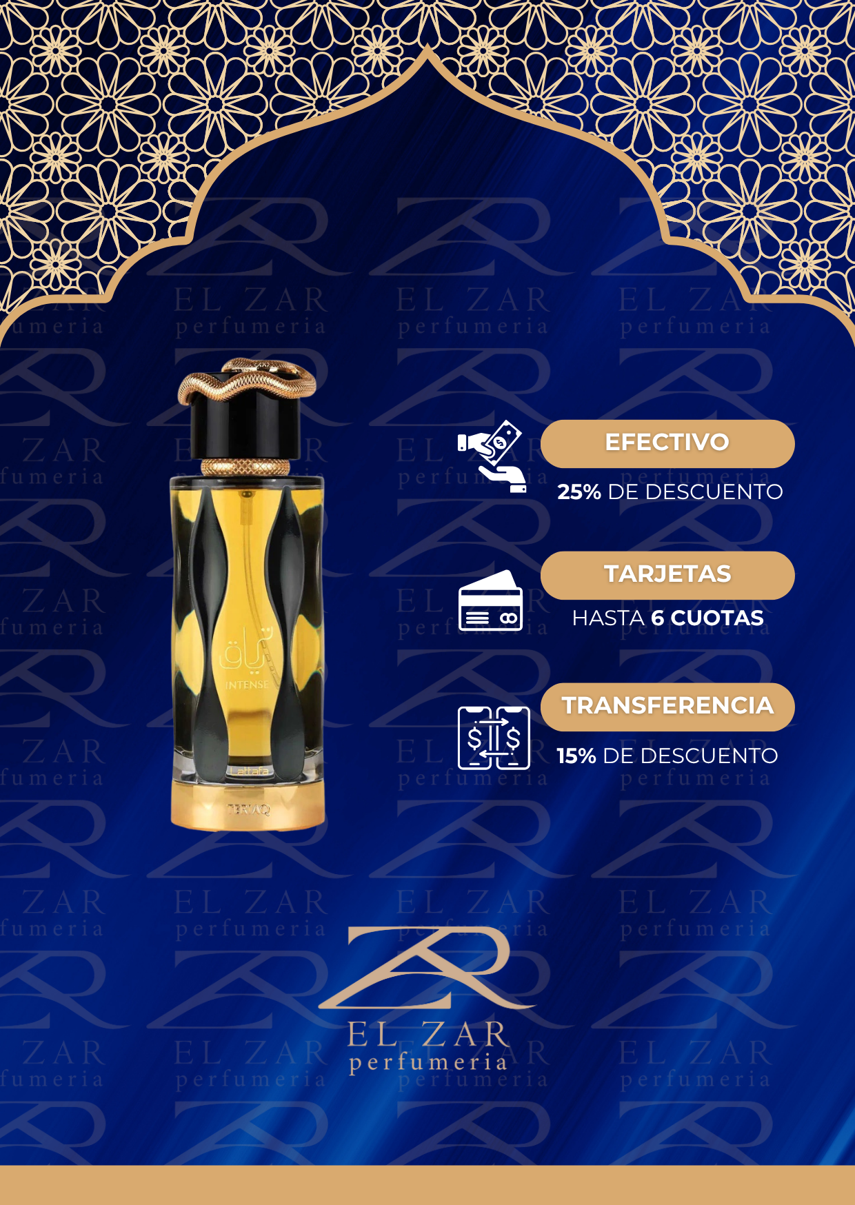 Teriaq Intense de Lattafa Perfumes es una fragancia de la familia olfativa Oriental Especiada para Hombres y Mujeres. Esta fragrancia es nueva. Teriaq Intense se lanzó en 2024. La Nariz detrás de esta fragrancia es Quentin Bisch. Las Notas de Salida son azafrán y bergamota; las Notas de Corazón son Plum Liquor y canela; las Notas de Fondo son ámbar, haba tonka y benjuí.
