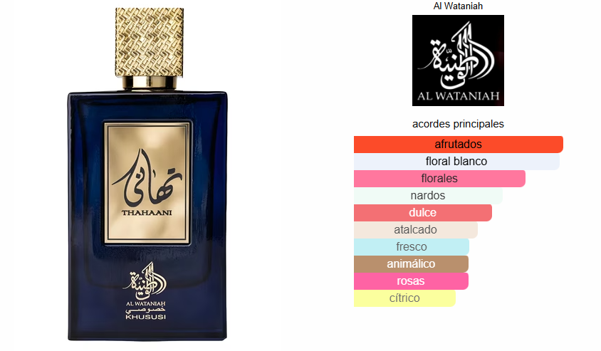Thahaani de Al Wataniah es una fragancia de la familia olfativa Oriental Especiada para Hombres y Mujeres. Thahaani se lanzó en 2022. Las Notas de Salida son durazno (melocotón), osmanto (olivo oloroso), peonía, rosa, hojas de violeta y aldehídos; las Notas de Corazón son nardos, flor de azahar del naranjo, ciruela, rosa y heliotropo; las Notas de Fondo son almizcle, ámbar, sándalo y musgo de roble.