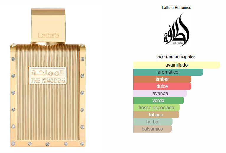 The Kingdom For Men de Lattafa Perfumes es una fragancia de la familia olfativa Aromática para Hombres. Esta fragrancia es nueva. The Kingdom For Men se lanzó en 2024. Las Notas de Salida son lavanda, menta y salvia; las Notas de Corazón son vainilla, tabaco y flor de azahar del naranjo; las Notas de Fondo son haba tonka, benjuí y ládano.