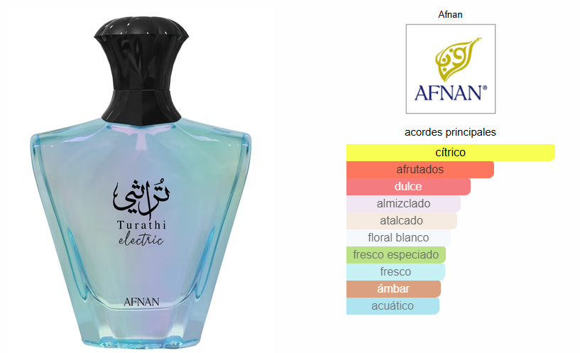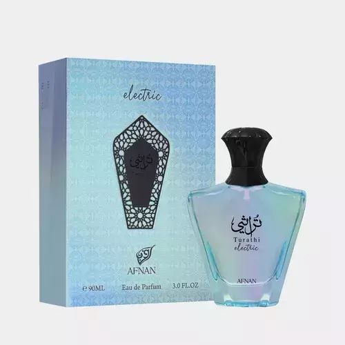 Turathi Electric de Afnan es una fragancia de la familia olfativa Floral Frutal para Hombres y Mujeres. Esta fragrancia es nueva. Turathi Electric se lanzó en 2025. La Nariz detrás de esta fragrancia es Imran Fazlani. Las Notas de Salida son pera, mandarina, toronja (pomelo) rosada y bergamota; las Notas de Corazón son flor de azahar del naranjo, manzana y cedro; las Notas de Fondo son almizcle, ámbar y vainilla.
