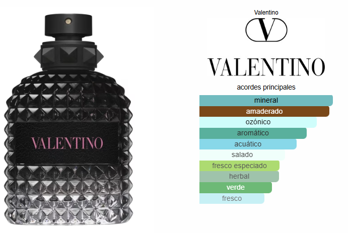 Valentino Uomo Born in Roma de Valentino es una fragancia de la familia olfativa Amaderada Especiada para Hombres. Valentino Uomo Born in Roma se lanzó en 2019. Valentino Uomo Born in Roma fue creada por Antoine Maisondieu y Guillaume Flavigny. Las Notas de Salida son Notas minerales, hojas de violeta y sal; las Notas de Corazón son jengibre y salvia; las Notas de Fondo son notas amaderadas y vetiver.