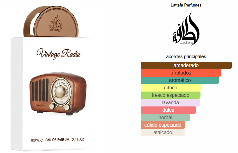 Vintage Radio de Lattafa Perfumes es una fragancia de la familia olfativa Oriental Amaderada para Hombres y Mujeres. Vintage Radio se lanzó en 2023. Las Notas de Salida son lavanda, salvia y bergamota; las Notas de Corazón son ciruela, palo santo y pimienta negra; las Notas de Fondo son sándalo y madera de oud.