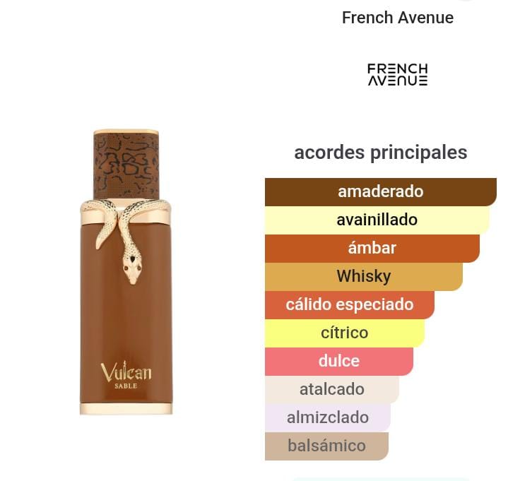 Vulcan Sable de French Avenue es una fragancia de la familia olfativa Aromática para Hombres y Mujeres. Esta fragrancia es nueva. Vulcan Sable se lanzó en 2025. Las Notas de Salida son whisky, naranja, cilantro y mandarina; las Notas de Corazón son haba tonka, cachemira, styrax y anís; las Notas de Fondo son vainilla, pachulí y benjuí.