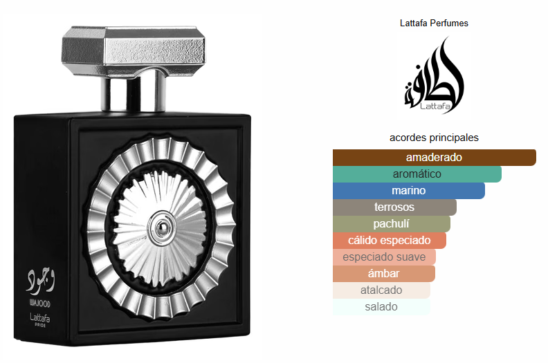 Wajood de Lattafa Perfumes es una fragancia de la familia olfativa Aromática Acuática para Hombres y Mujeres. Wajood se lanzó en 2022. Las Notas de Salida son notas marinas y pimienta rosa; las Notas de Corazón son vetiver y pachulí; las Notas de Fondo son sándalo y ámbar.