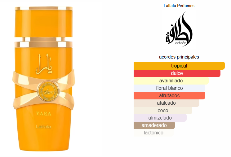 Yara Tous de Lattafa Perfumes es una fragancia de la familia olfativa para Mujeres. Yara Tous se lanzó en 2023. Las Notas de Salida son mango, coco y maracuyá (fruta de la pasión); las Notas de Corazón son jazmín, flor de azahar del naranjo y heliotropo; las Notas de Fondo son vainilla, almizcle y cachemira.