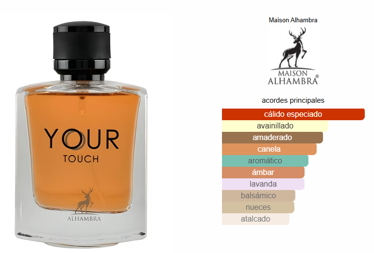 Your Touch de Maison Alhambra es una fragancia de la familia olfativa Oriental para Hombres. Your Touch se lanzó en 2022. Las Notas de Salida son cardamomo, hojas de violeta, pimienta rosa y menta; las Notas de Corazón son canela, lavanda, salvia, sandía y piña; las Notas de Fondo son vainilla, castaña, Amberwood, cedro y madera de gaiac.