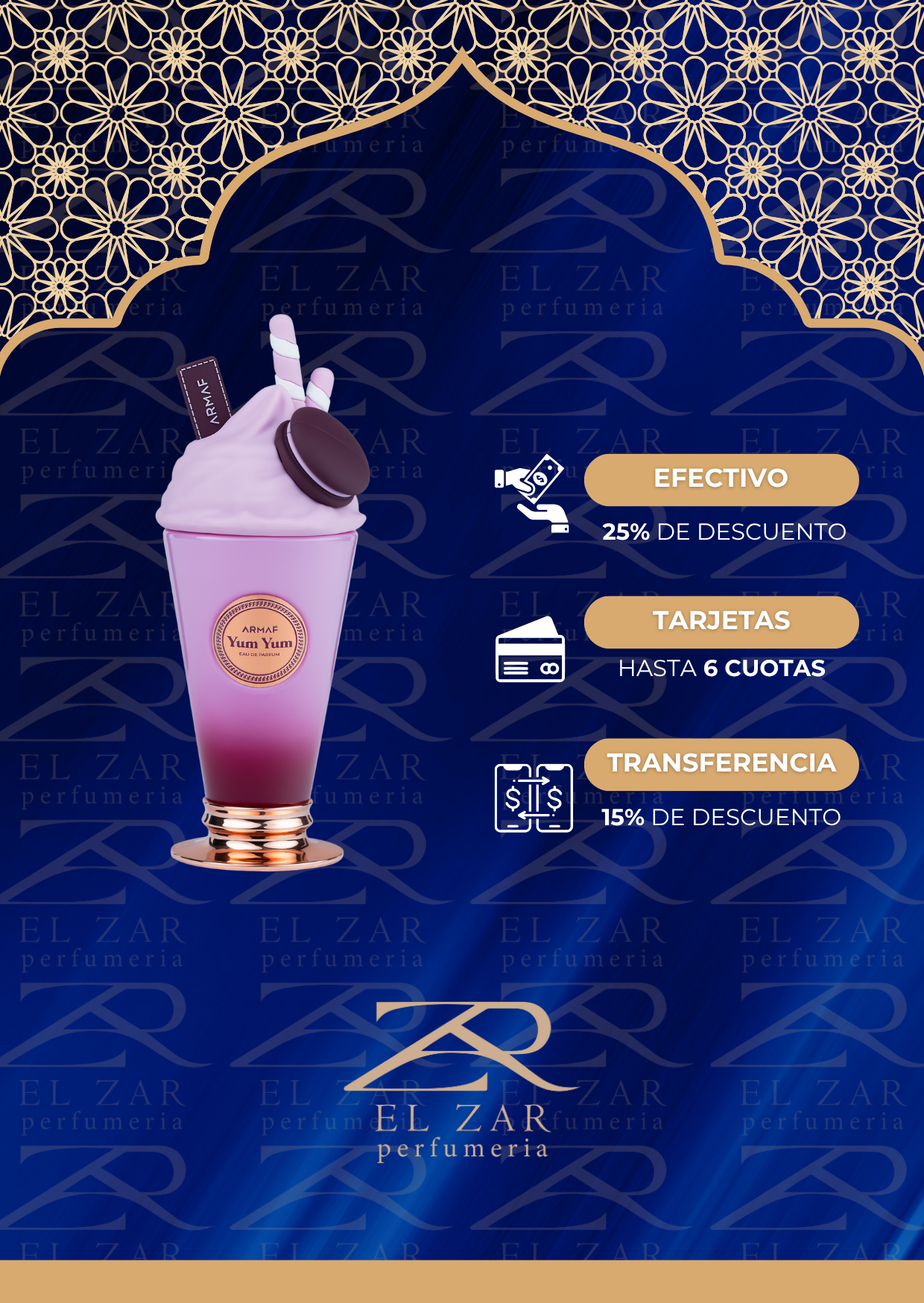 Yum Yum de Armaf es una fragancia floral frutal para mujer. Esta nueva fragancia se lanzó en 2024. Sus notas de salida son bayas silvestres, cereza, naranja y bergamota; sus notas de corazón son rosa, flores blancas y vainilla; y sus notas de fondo son notas atalcadas, almizcle y ámbar.